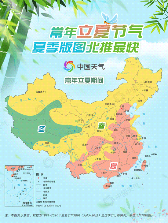 常年立夏節(jié)氣期間,全國(guó)夏季版圖開(kāi)始迅速北推,且速度是最快的。夏天的腳步從華南、江南中部等地一路北擴(kuò),越過(guò)長(zhǎng)江、江漢平原等地,最北能抵達(dá)華北中部地區(qū),長(zhǎng)沙(5月11日)、武漢(5月12日)、鄭州(5月17日)、濟(jì)南(5月17日)、石家莊(5月17日)、合肥(5月18日)、天津(5月18日)、南京(5月19日)等城市常年均在立夏節(jié)氣期間入夏。