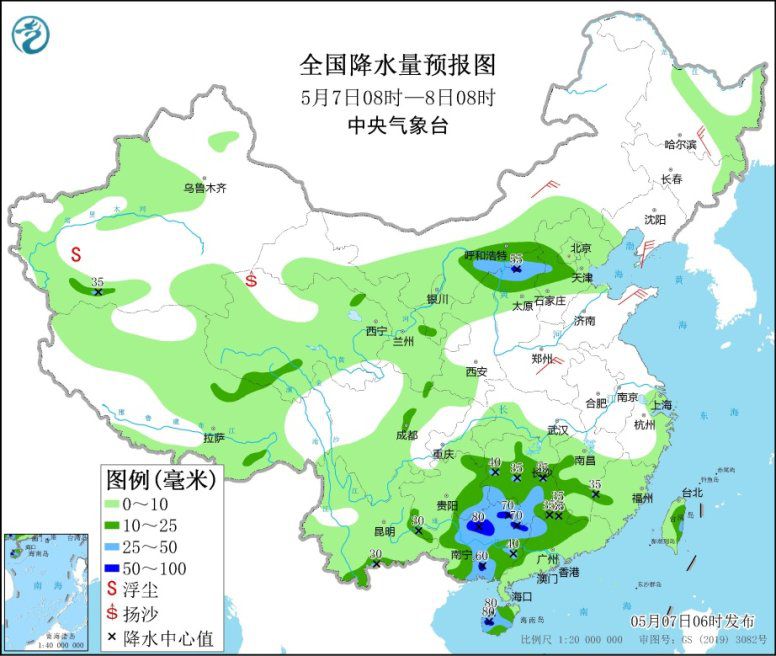 5月7日08時(shí)至8日08時(shí),內(nèi)蒙古河套地區(qū)、陜西北部、山西北部、河北西部、重慶東南部、貴州東部和南部、云南東部和南部、湖南中南部、江西南部、廣西、廣東北部和西部、海南島等地的部分地區(qū)有中到大雨,其中,山西北部、廣西北部和東南部、海南島中西部等地局地暴雨(50~90毫米)。內(nèi)蒙古、西北地區(qū)東部、東北地區(qū)北部和南部、華北北部和西部、黃淮大部、江南東部、西藏中北部等地的部分地區(qū)有4~6級(jí)風(fēng)(見(jiàn)圖1);渤海、渤海海峽有6~7級(jí)、陣風(fēng)8級(jí)的偏北風(fēng)。