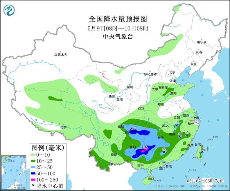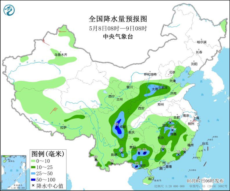 5月8日08時(shí)至9日08時(shí),甘肅南部、陜西北部和西南部、山西中部、河北南部、四川盆地西部、貴州西部和南部、云南東部和南部、湖北東南部、江西、湖南東部和南部、廣西、廣東北部、福建南部等地的部分地區(qū)有中到大雨,其中,四川盆地西部和南部、廣西北部和南部等地局地暴雨(50~90毫米)。新疆北部、江南東部、西藏中北部等地的部分地區(qū)有4~6級(jí)風(fēng)(見(jiàn)圖2)。
