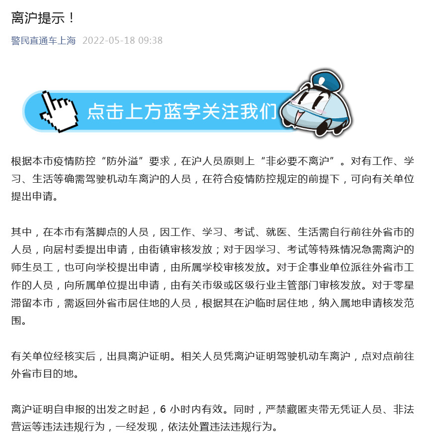 上海:確需駕車離滬人員可提出申請 離滬證明6小時內(nèi)有效