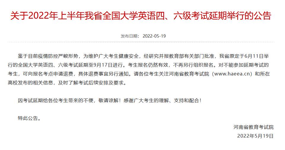 河南省全國大學(xué)英語四、六級考試延期至9月17日