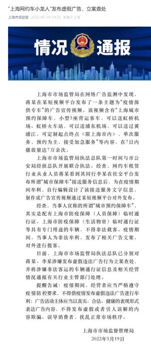 中新財經(jīng)5月19日電 據(jù)“上海市場監(jiān)管”微信公眾號19日消息,上海市市場監(jiān)管局在網(wǎng)絡(luò)廣告監(jiān)測中發(fā)現(xiàn),蔣某在某短視頻平臺發(fā)布了一條主題為“疫情保供專車”的廣告宣傳視頻。經(jīng)查,當事人宣稱的所謂“城市預約保障車”,其實是配有上海市防疫保障(人員保障)臨時通行證、上海市防疫保障(生活物資)臨時通行證等具有專門用途的車輛,不得非法載客。疫情期間,當事人為非法牟利,發(fā)布了相關(guān)廣告文案,對外進行攬客。