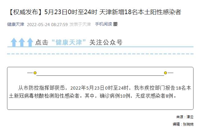 中新網(wǎng)5月24日電 據(jù)天津衛(wèi)健委官方微信消息,從天津市防控指揮部獲悉,2022年5月23日0時至24時,天津市疾控部門報告18名本土新冠病毒核酸檢測陽性感染者。其中,確診病例10例,無癥狀感染者8例。