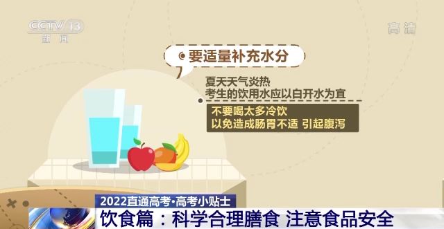 同時,要適量補充水分。夏天天氣炎熱,考生的飲用水應(yīng)以白開水為宜,不要喝太多冷飲,以免造成腸胃不適,引起腹瀉。如遇高溫天氣,建議考生適當補充淡鹽水,多吃新鮮蔬果,清淡飲食。
