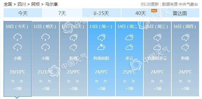 中央氣象臺預(yù)計(jì),今起三天,馬爾康市多降雨,其中今明天有小雨,后天有陣雨。早晚氣溫較低,最低氣溫在10℃左右,最高氣溫19~23℃。