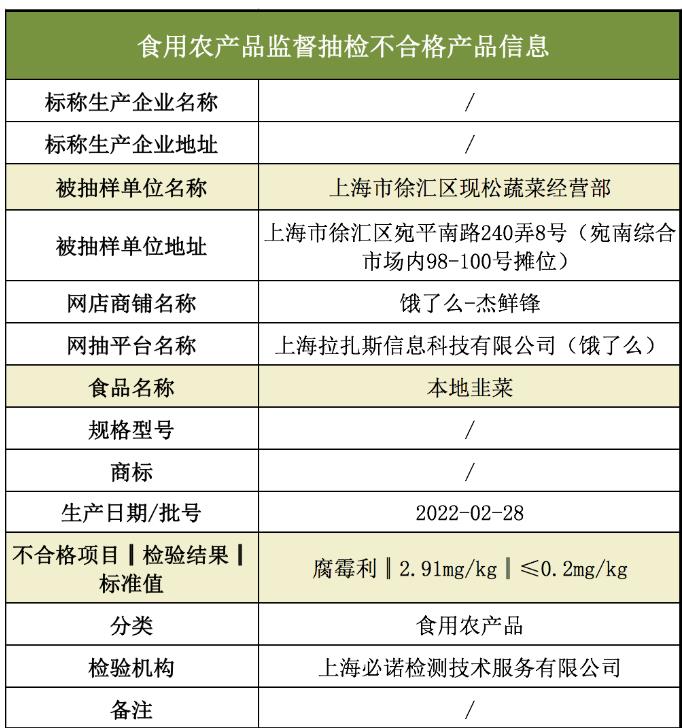 上海市場(chǎng)監(jiān)管局通報(bào) 餓了么上銷售的這批韭菜不合格