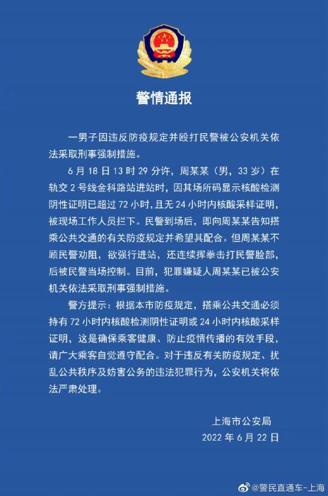 6月18日13時(shí)29分許,周某某(男,33歲)在軌交2號(hào)線金科路站進(jìn)站時(shí),因其場(chǎng)所碼顯示核酸檢測(cè)陰性證明已超過72小時(shí),且無24小時(shí)內(nèi)核酸采樣證明,被現(xiàn)場(chǎng)工作人員攔下。民警到場(chǎng)后,即向周某某告知搭乘公共交通的有關(guān)防疫規(guī)定并希望其配合。但周某某不顧民警勸阻,欲強(qiáng)行進(jìn)站,還連續(xù)揮拳擊打民警臉部,后被民警當(dāng)場(chǎng)控制。目前,犯罪嫌疑人周某某已被公安機(jī)關(guān)依法采取刑事強(qiáng)制措施。