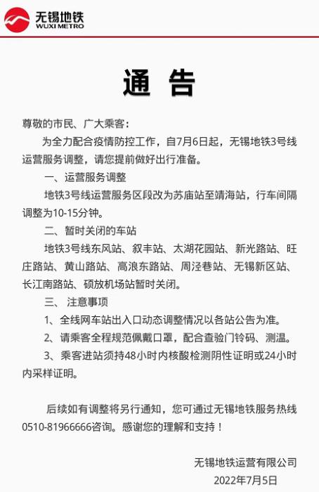 地鐵3號(hào)線東風(fēng)站、敘豐站、太湖花園站、新光路站、旺莊路站、黃山路站、高浪東路站、周涇巷站、無(wú)錫新區(qū)站、長(zhǎng)江南路站、碩放機(jī)場(chǎng)站暫時(shí)關(guān)閉。