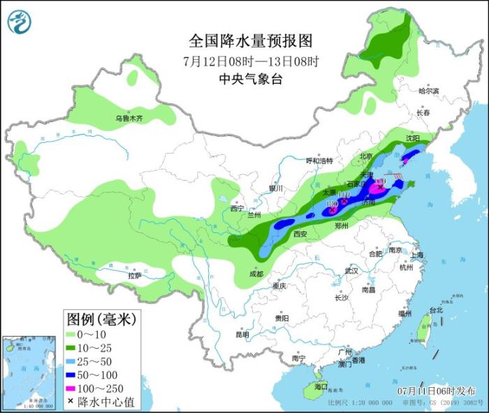 7月11日08時至12日08時,甘肅南部、陜西中北部、內(nèi)蒙古河套地區(qū)、西北地區(qū)東部、山西、河北中南部、北京南部、天津、山東中北部、河南西北部、四川盆地西北部等地有中到大雨,其中,甘肅東南部、內(nèi)蒙古河套地區(qū)、陜西北部、山西中北部、河北南部、山東中部和西北部等地的部分地區(qū)有暴雨或大暴雨(100~130毫米)。新疆南疆盆地部分地區(qū)有4~6級風(fēng)。南海南部海域?qū)⒂?~6級、陣風(fēng)7級的偏西到西南風(fēng)。