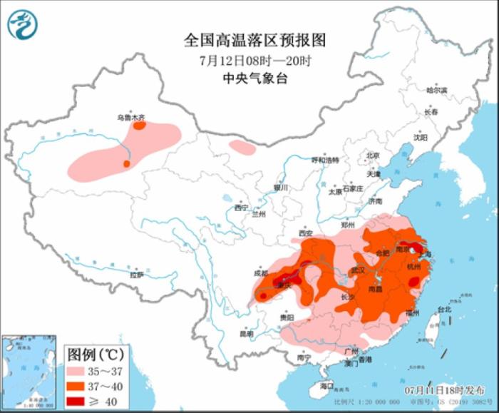 全國高溫落區(qū)預(yù)報圖(7月12日08時-20時)
