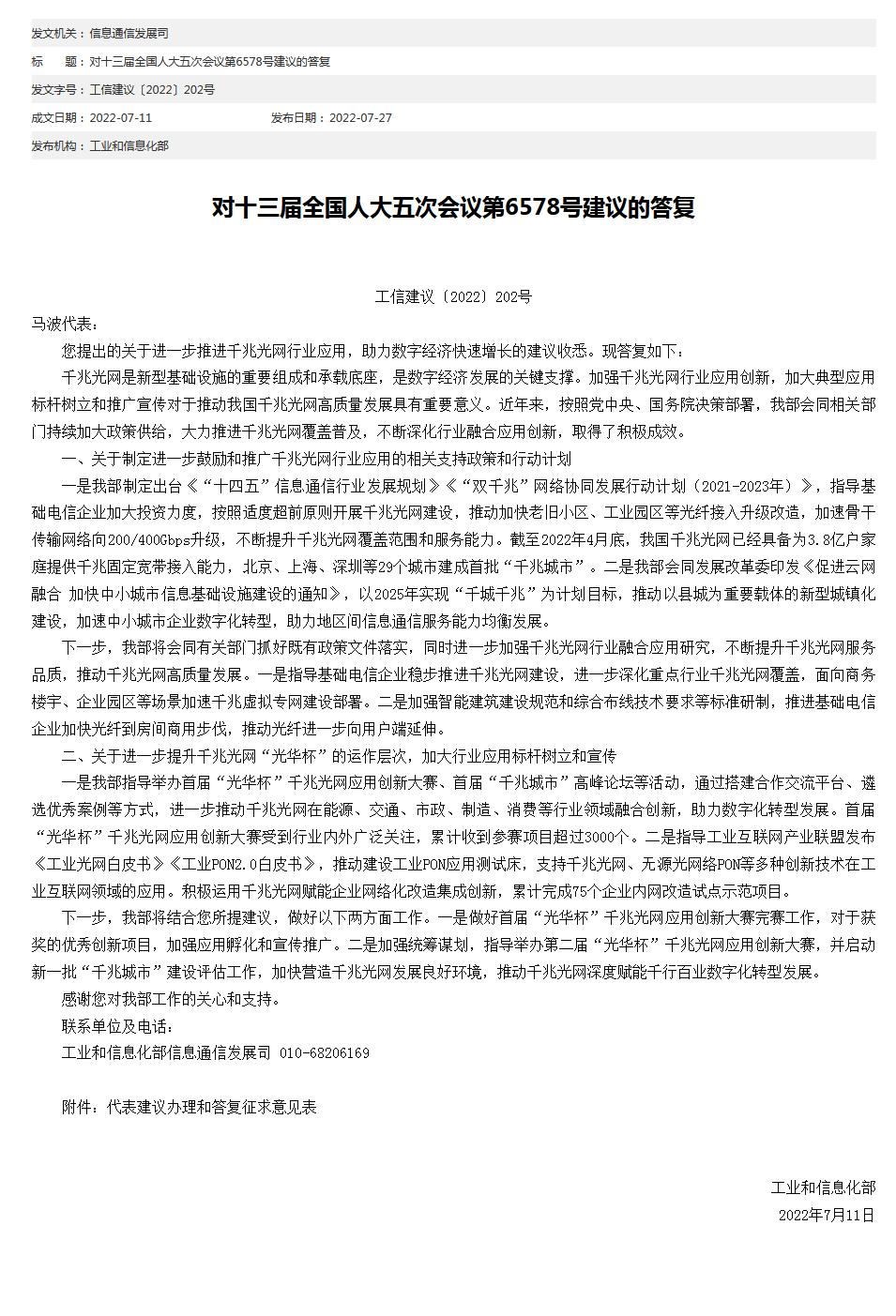 中新網(wǎng)7月27日電 工信部網(wǎng)站27日發(fā)布對(duì)十三屆全國(guó)人大五次會(huì)議第6578號(hào)建議的答復(fù)。工信部表示,下一步,將會(huì)同有關(guān)部門抓好既有政策文件落實(shí),同時(shí)進(jìn)一步加強(qiáng)千兆光網(wǎng)行業(yè)融合應(yīng)用研究,不斷提升千兆光網(wǎng)服務(wù)品質(zhì),推動(dòng)千兆光網(wǎng)高質(zhì)量發(fā)展。一是指導(dǎo)基礎(chǔ)電信企業(yè)穩(wěn)步推進(jìn)千兆光網(wǎng)建設(shè),進(jìn)一步深化重點(diǎn)行業(yè)千兆光網(wǎng)覆蓋,面向商務(wù)樓宇、企業(yè)園區(qū)等場(chǎng)景加速千兆虛擬專網(wǎng)建設(shè)部署。二是加強(qiáng)智能建筑建設(shè)規(guī)范和綜合布線技術(shù)要求等標(biāo)準(zhǔn)研制,推進(jìn)基礎(chǔ)電信企業(yè)加快光纖到房間商用步伐,推動(dòng)光纖進(jìn)一步向用戶端延伸。(中新財(cái)經(jīng))