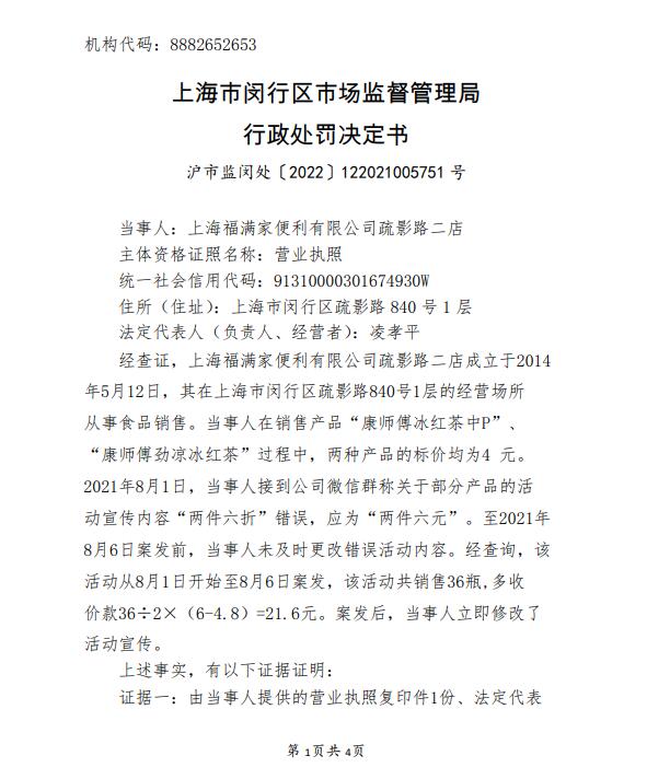 行政處罰決定書顯示,當事人在銷售冰紅茶時,兩種產(chǎn)品的標價均為4元。2021年8月1日,當事人接到公司微信群稱關于部分產(chǎn)品的活動宣傳內(nèi)容“兩件六折”錯誤,應為“兩件六元”。至2021年8月6日案發(fā)前,當事人未及時更改錯誤活動內(nèi)容。經(jīng)查詢,該活動從8月1日開始至8月6日案發(fā),該活動共銷售36瓶,多收價款36÷2×(6-4.8)=21.6元。案發(fā)后,當事人立即修改了活動宣傳。(中新財經(jīng))
