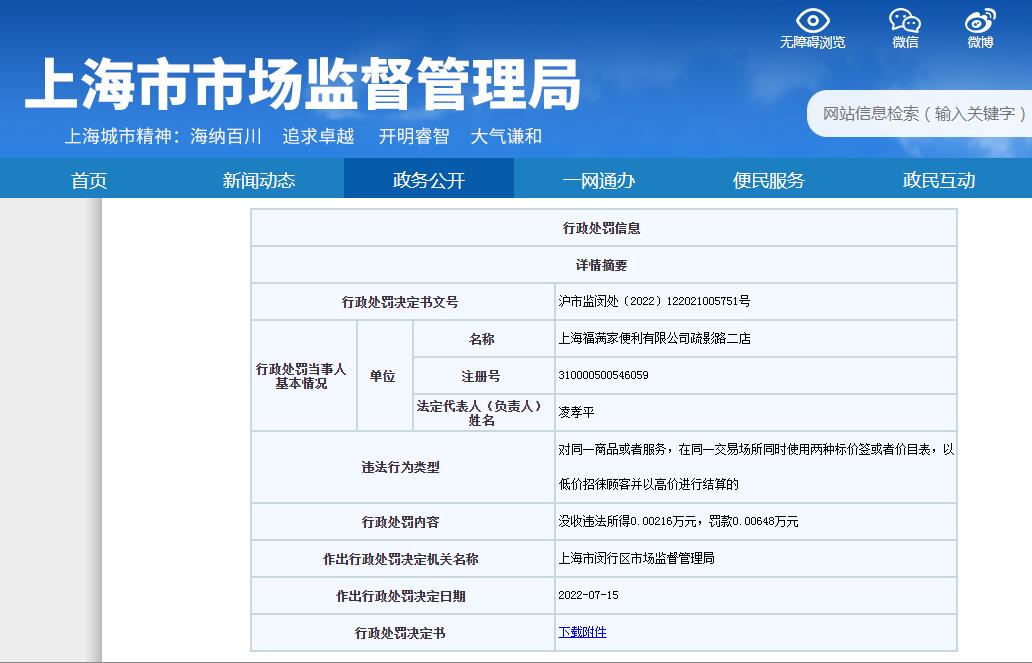 中新網(wǎng)7月27日電 上海市市場監(jiān)督管理局網(wǎng)站顯示,近日,上海福滿家便利有限公司疏影路二店,因?qū)ν簧唐坊蛘叻?,在同一交易場所同時使用兩種標價簽或者價目表,以低價招徠顧客并以高價進行結(jié)算,被上海市閔行區(qū)市場監(jiān)督管理局沒收違法所得21.6元、罰款64.8元。