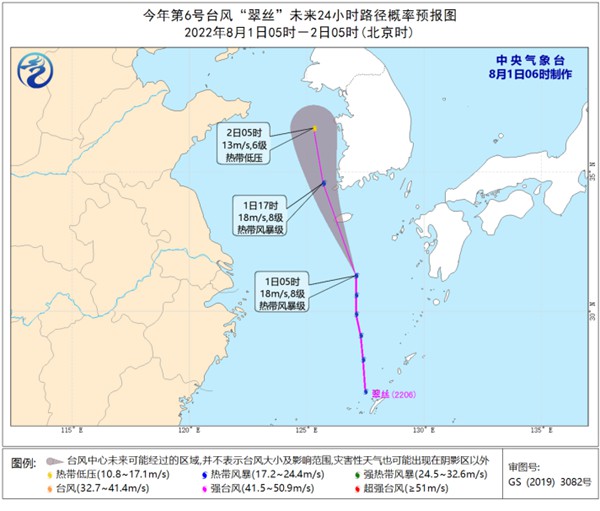 此外,今年第6號臺風(fēng)“翠絲”已于昨天下午生成,其中心今天早晨05時位于韓國濟州島南偏東方向約250公里的東海北部海面上,預(yù)計將以每小時30-35公里的速度向北偏西方向移動,強度逐漸減弱并消散。