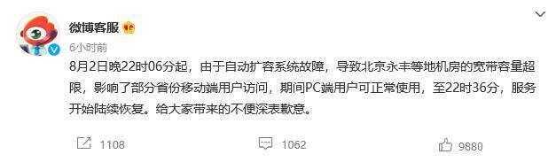 微博:2日晚自動擴容系統(tǒng)故障 致北京永豐等地機房寬帶容量超限