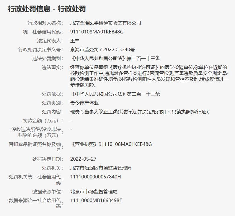 據(jù)信用中國(guó)(北京)網(wǎng)站5月31日行政處罰信息顯示,北京金準(zhǔn)醫(yī)學(xué)檢驗(yàn)實(shí)驗(yàn)室有限公司在近期的核酸檢測(cè)工作中,違規(guī)對(duì)多管樣本進(jìn)行3管混管檢測(cè),嚴(yán)重違反質(zhì)量安全規(guī)定,影響檢測(cè)結(jié)果準(zhǔn)確性,導(dǎo)致對(duì)核酸檢測(cè)陽性人員發(fā)現(xiàn)和管控不及時(shí),造成疫情進(jìn)一步傳播風(fēng)險(xiǎn)。北京市海淀區(qū)市場(chǎng)監(jiān)督管理局決定吊銷其執(zhí)照(登記證)。(中新財(cái)經(jīng))