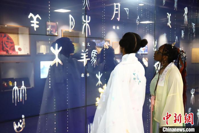 外國(guó)留學(xué)生通過(guò)觸摸電子屏幕體驗(yàn)學(xué)習(xí)漢字文化、了解漢字的演變歷程。 隋翔 攝