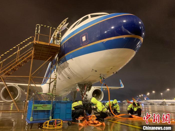 南航機(jī)務(wù)人員完成所有停場飛機(jī)前起落架與主起落架系留?!∧虾焦﹫D