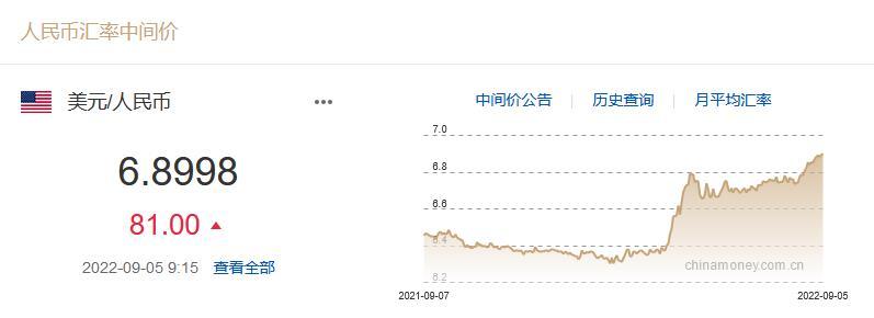 9月5日人民幣對美元中間價報6.8998 下調(diào)81個基點
