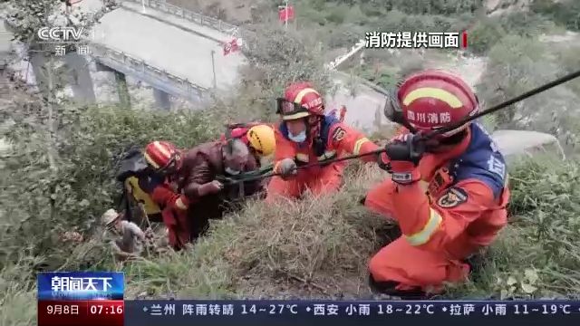 繩橋搭建完成后,消防員徒步跨過(guò)阻擋在道路中央的石塊,將小孩和病情危重的老人進(jìn)行轉(zhuǎn)移。