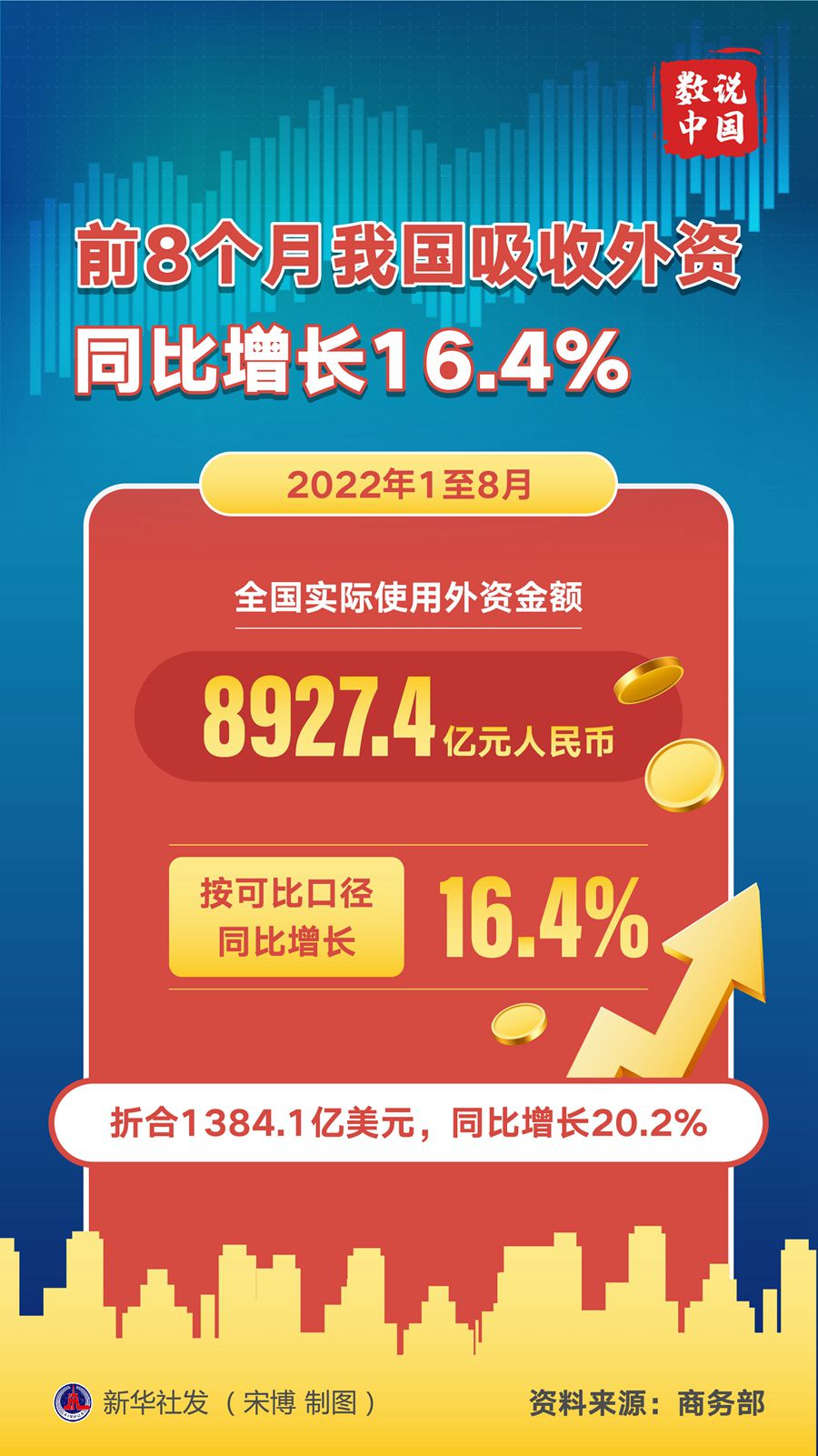 新華社北京9月19日電 (記者 謝?,?記者19日從商務部獲悉,2022年1至8月,全國實際使用外資金額8927.4億元人民幣,按可比口徑同比增長16.4%(下同),折合1384.1億美元,同比增長20.2%。