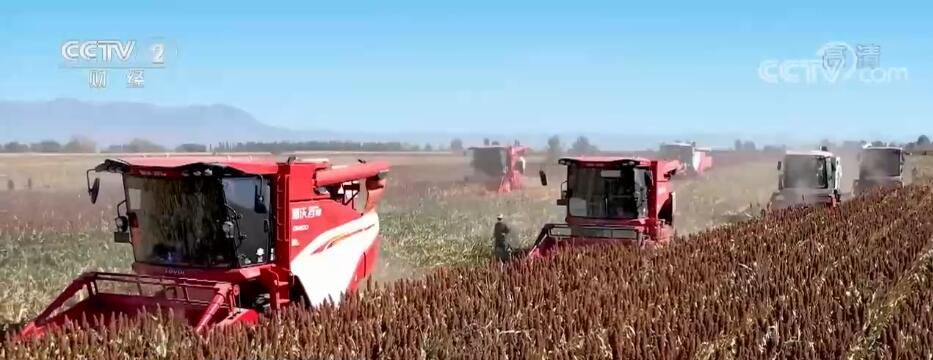 央視網(wǎng)消息:金秋時節(jié),甘肅省張掖市民樂縣的1.2萬畝高粱已經(jīng)成熟了,紅色的高粱和穿梭的聯(lián)合收割機構成一幅色彩艷麗的豐收畫卷。