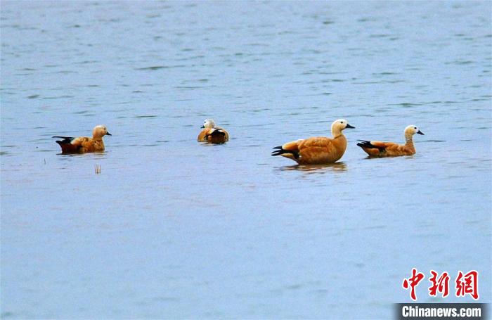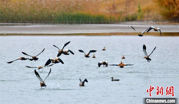 中新網(wǎng)蘭州10月31日電 (記者 馮志軍)“金秋天漸涼,又遇候鳥南飛時(shí)?!苯谝詠?,甘肅酒泉市敦煌鳴沙山下黨河濕地內(nèi),首次出現(xiàn)時(shí)而嬉戲,時(shí)而盤旋起舞的50余只國家二級保護(hù)動(dòng)物野生黃鴨,它們悠閑游弋、覓食。作為候鳥遷徙線上不可或缺的“休息站”,這是酒泉市眾多大漠濕地近年“變身”鳥類樂園的一個(gè)縮影。