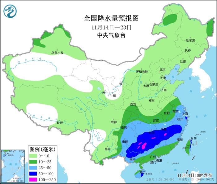 未來10天(11月14-23日),江南大部、華南西部及貴州等地累計(jì)降水量有25~40毫米,其中江南中南部及廣西中北部等地部分地區(qū)有50~80毫米、局部100毫米以上;上述地區(qū)降水量較常年同期偏多3~6成,局地偏多1倍以上;其余地區(qū)降水接近常年或偏少。