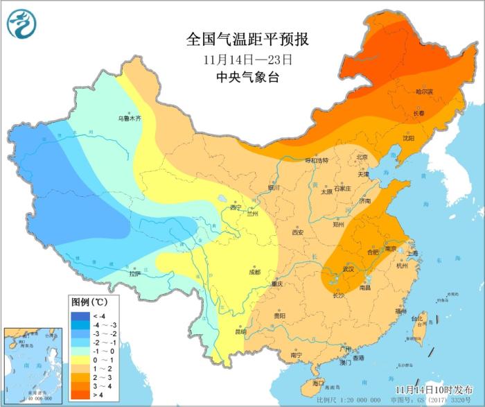 中新網(wǎng)11月14日電 據(jù)中央氣象臺(tái)網(wǎng)站消息,未來10天(11月14-23日),除新疆西部、青藏高原大部等地平均氣溫較常年同期偏低1~2℃,中東部大部地區(qū)偏高1~2℃,內(nèi)蒙古東部、東北地區(qū)中北部偏高3~4℃。未來10天,江南大部、華南西部及貴州等地累計(jì)降水量有25~40毫米,其中江南中南部及廣西中北部等地部分地區(qū)有50~80毫米、局部100毫米以上;上述地區(qū)降水量較常年同期偏多3~6成,局地偏多1倍以上;其余地區(qū)降水接近常年或偏少。