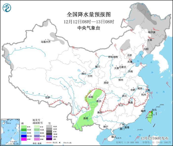 12月12日08時至13日08時,新疆阿勒泰和南疆盆地西部山區(qū)、內(nèi)蒙古中部和東北部、黑龍江、吉林中東部、遼寧東部等地的部分地區(qū)有小到中雪或雨夾雪。四川東部、云南東部和南部、臺灣島等地的部分地區(qū)有小雨,局地中雨。華北大部、東北地區(qū)大部、河南東部、山東半島等地的部分地區(qū)有4~6級風(fēng),其中,內(nèi)蒙古中西部等地部分地區(qū)有6~7級風(fēng)(見圖3)。