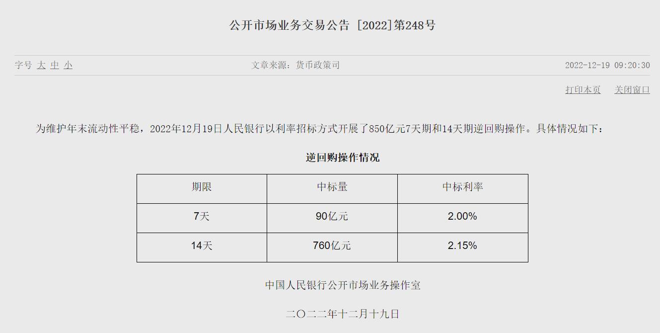 中新網(wǎng)12月19日電 據(jù)央行官網(wǎng)19日消息,為維護(hù)年末流動性平穩(wěn),2022年12月19日人民銀行以利率招標(biāo)方式開展了850億元7天期和14天期逆回購操作。(中新財(cái)經(jīng))