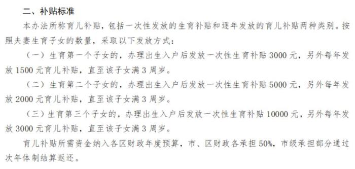 辦法擬規(guī)定,按照夫妻生育子女的數(shù)量,發(fā)放育兒補貼。其中,生育第一個子女的,辦理出生入戶后發(fā)放一次性生育補貼3000元,另外每年發(fā)放1500元育兒補貼,直至該子女滿3周歲;生育第二個子女的,辦理出生入戶后發(fā)放一次性生育補貼5000元,另外每年發(fā)放2000元育兒補貼,直至該子女滿3周歲;生育第三個子女的,辦理出生入戶后發(fā)放一次性生育補貼10000元,另外每年發(fā)放3000元育兒補貼,直至該子女滿3周歲。育兒補貼所需資金納入各區(qū)財政年度預算,市、區(qū)財政各承擔50%,市級承擔部分通過次年體制結算返還。(中新財經(jīng))