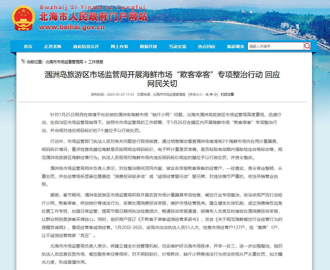 中新網1月28日電 據北海市市場監(jiān)督管理局網站27日消息,針對1月25日網民在微博平臺反映的潿洲島海鮮市場“缺斤少兩”問題,北海市潿洲島旅游區(qū)市場監(jiān)管局高度重視,迅速行動,在自治區(qū)市場監(jiān)管局指導下,按照市市場監(jiān)管局的工作部署,于1月26日在轄區(qū)內開展海鮮市場“欺客宰客”專項整治行動,并當場對違反明碼標價的7個攤位予以行政處罰。