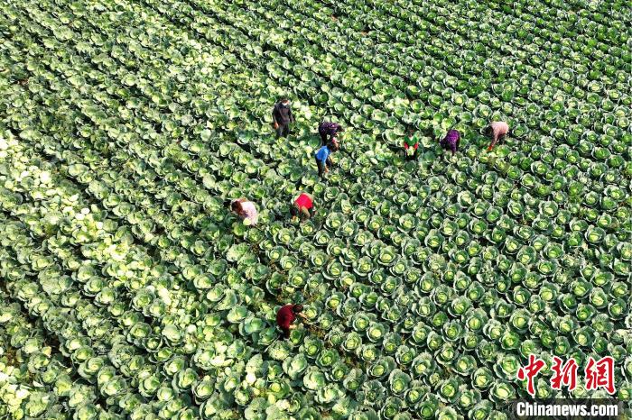 資料圖:村民在收獲甘藍(lán)菜。(無人機照片) 郜玉華 攝