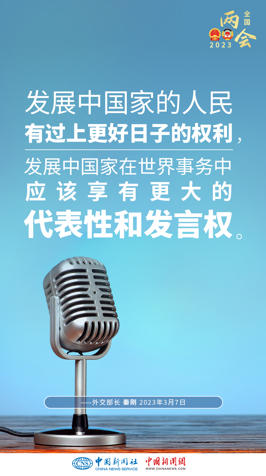 秦剛:發(fā)展中國家占世界人口總數(shù)的80%以上,對世界經(jīng)濟增長的貢獻率超過70%。發(fā)展中國家的人民有過上更好日子的權(quán)利,發(fā)展中國家在世界事務(wù)中應(yīng)該享有更大的代表性和發(fā)言權(quán)。
