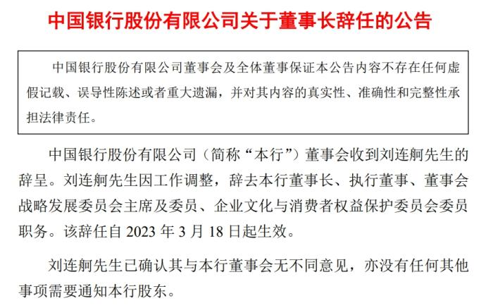 中新網3月19日電 19日晚間,中國銀行發(fā)布公告,公司董事會收到劉連舸的辭呈。劉連舸因工作調整,辭去中國銀行董事長、執(zhí)行董事、董事會戰(zhàn)略發(fā)展委員會主席及委員、企業(yè)文化與消費者權益保護委員會委員職務。該辭任自2023年3月18日起生效。(中新財經)