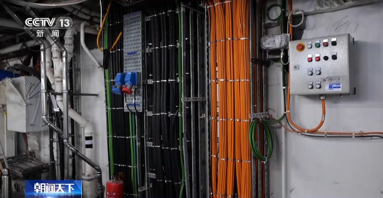 總臺(tái)央視記者 李寧:如何確保這樣一艘海上巨無霸的正常運(yùn)行,靠的就是我身后的這些電纜,這些電纜就好比這艘船上的神經(jīng)和血管,它的總長度超過4300公里,比哈爾濱到三亞的距離還要遠(yuǎn)。
