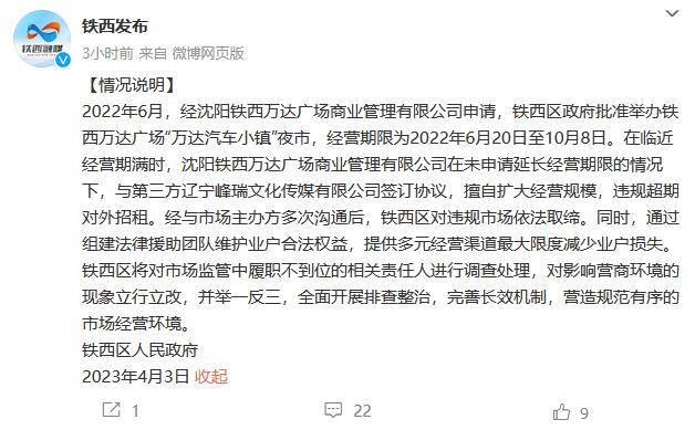 中新網4月3日電 鐵西發(fā)布官方微博3日發(fā)布情況說明:2022年6月,經沈陽鐵西萬達廣場商業(yè)管理有限公司申請,鐵西區(qū)政府批準舉辦鐵西萬達廣場“萬達汽車小鎮(zhèn)”夜市,經營期限為2022年6月20日至10月8日。在臨近經營期滿時,沈陽鐵西萬達廣場商業(yè)管理有限公司在未申請延長經營期限的情況下,與第三方遼寧峰瑞文化傳媒有限公司簽訂協(xié)議,擅自擴大經營規(guī)模,違規(guī)超期對外招租。