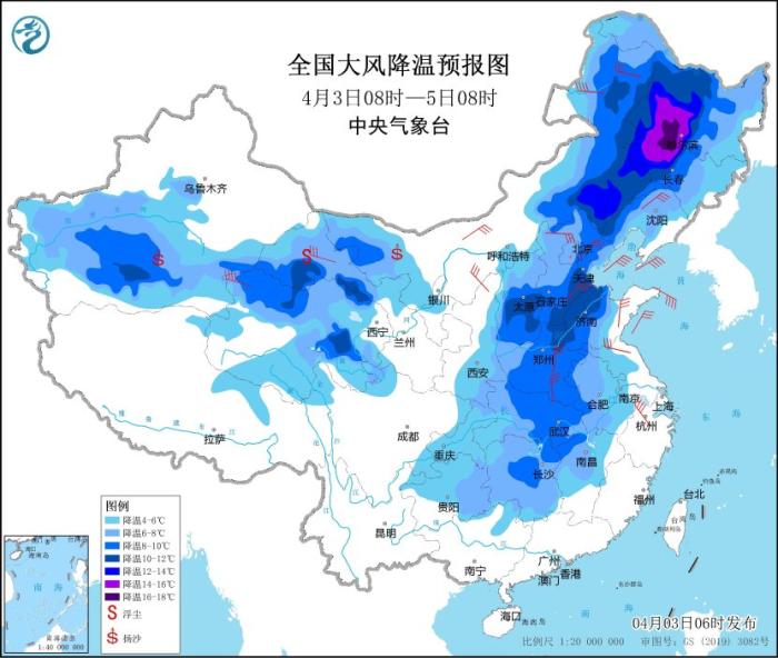 受較強(qiáng)冷空氣影響,4月3日08時至5日08時,新疆南疆盆地、西北地區(qū)中部、內(nèi)蒙古西部和東北部、華北、東北地區(qū)、黃淮、江漢、江淮中西部、江南中西部等地氣溫將下降4~8℃,其中,內(nèi)蒙東北部、東北地區(qū)西部、華北南部等地局地降溫幅度可達(dá)10℃以上;上述部分地區(qū)并有5~6級偏北風(fēng),陣風(fēng)7~9級。新疆南部和東部、內(nèi)蒙古西部、甘肅西部等地有沙塵天氣(見圖1)。3日夜間,渤海、黃海西南部海域、東海西北部海域、長江口附近海域?qū)⒂?級、陣風(fēng)9級的大風(fēng),其中渤海灣將有9級、陣風(fēng)10級的大風(fēng)。中央氣象臺4月3日06時繼續(xù)發(fā)布大風(fēng)降溫預(yù)報(bào)和海上大風(fēng)黃色預(yù)警。