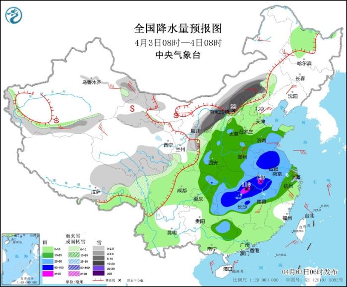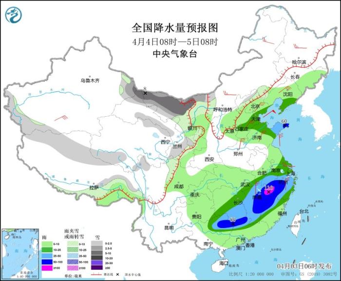 4月3日08時至4日08時,新疆南疆盆地和東部、西藏東部、西北地區(qū)中部和東北部、內(nèi)蒙古中部、川西高原北部、陜西北部、山西北部、河北北部等地部分地區(qū)有小到中雪或雨夾雪,其中,內(nèi)蒙古中部、河北西北部等地部分地區(qū)有大到暴雪,局地大暴雪(20~22毫米)。湖北東部和南部、湖南北部、江西北部、安徽、河南東部、山東南部、江蘇及陜西中部、山西中部、重慶北部、廣西東北部等地有大到暴雨,其中,安徽西南部、湖北東部、湖南北部等地部分地區(qū)有大暴雨(100~130毫米)。內(nèi)蒙古、東北地區(qū)西部、新疆南部、華北、黃淮、江淮等地部分地區(qū)有4~6級風(fēng),局部有6~7級風(fēng)(見圖3)。渤海、黃海西南部、東海西北部、長江口附近海域?qū)⒂?級、陣風(fēng)9級的大風(fēng),其中渤海灣將有9級、陣風(fēng)10級的大風(fēng)。