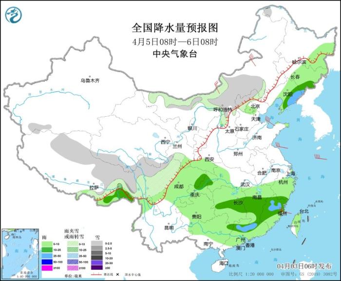 4月5日08時至6日08時,內(nèi)蒙古西部、西藏北部和東部、青海南部、山西北部、河北北部、川西高原北部等地部分地區(qū)有小雪或雨夾雪。西藏東南部、東北地區(qū)東部、西南地區(qū)東部、江漢西部、江南、華南大部、臺灣島等地部分地區(qū)有小到中雨,其中,遼寧東南部、廣東中北部、福建中部等地部分地區(qū)有大雨,局部有暴雨。內(nèi)蒙古中西部等地部分地區(qū)有4~6級風(fēng)(見圖5)。