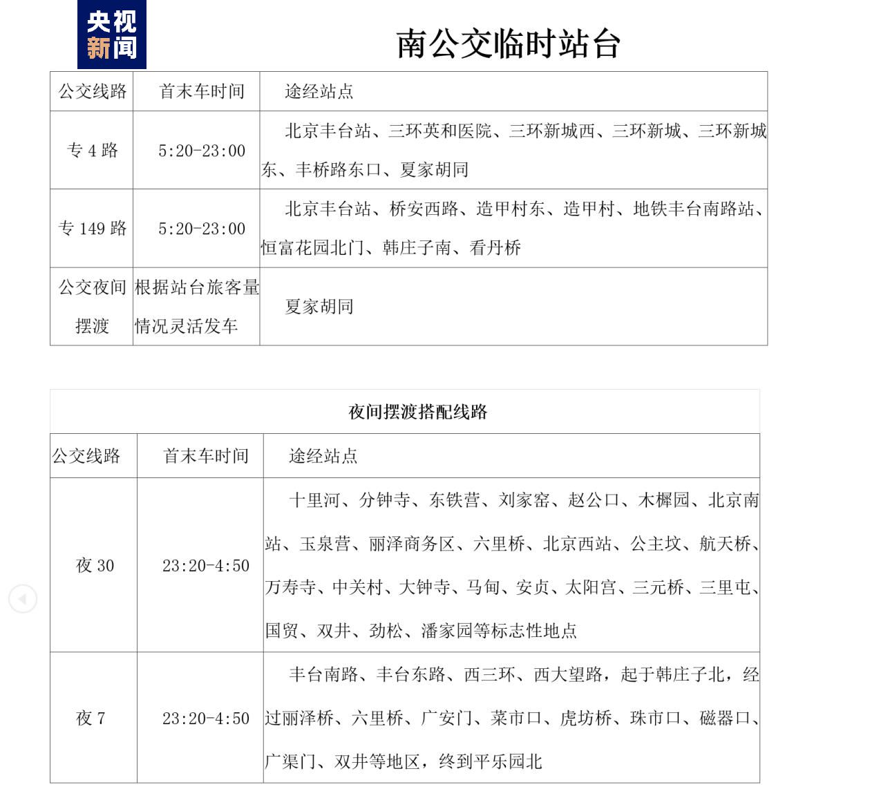 0時至5時,北京豐臺站,在出租車調(diào)度站及南廣場臨時公交站臺區(qū)域設(shè)有免費擺渡車幫助旅客離站,共計兩個方向,具體如下: