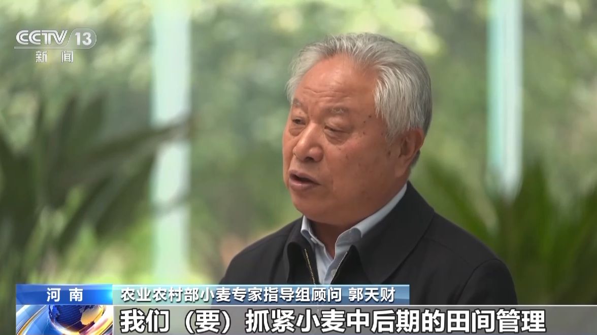 農(nóng)業(yè)農(nóng)村部小麥專家指導(dǎo)組顧問 郭天財(cái):我們要抓緊小麥中后期的田間管理,一個(gè)措施一個(gè)措施地把它落實(shí)落地,一個(gè)環(huán)節(jié)一個(gè)環(huán)節(jié),我們把它抓緊抓好,來鞏固和發(fā)展當(dāng)前苗情持續(xù)向好的態(tài)勢(shì),今年小麥豐收還是很有希望的。