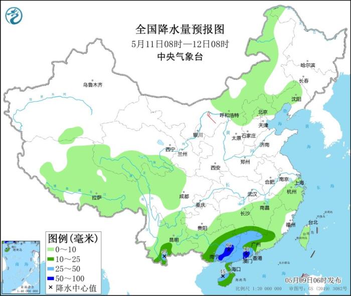 全國降水量預(yù)報(bào)圖(5月9日08時-10日08時)