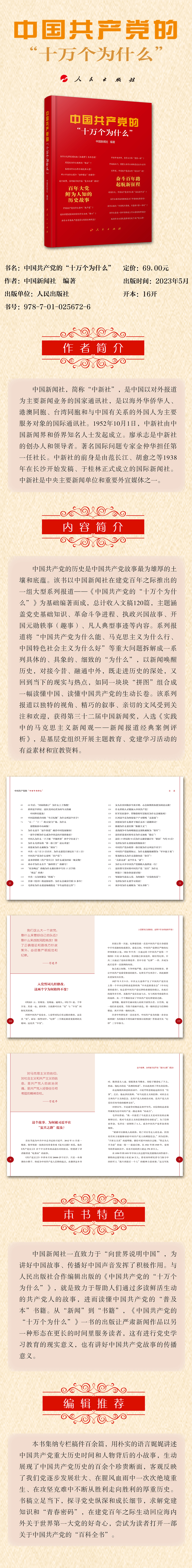中國共產(chǎn)黨的歷史是中國共產(chǎn)黨故事最為雄厚的土壤和底蘊(yùn)。該書以中國新聞社在建黨百年之際推出的一組大型系列報道——《中國共產(chǎn)黨的“十萬個為什么”》為基礎(chǔ)編著而成,總計收入文稿120篇,主題涵蓋黨史基礎(chǔ)知識、革命斗爭進(jìn)程、執(zhí)政興國故事、開國元勛軼事(趣事)、凡人典型事跡等內(nèi)容。系列報道將“中國共產(chǎn)黨為什么能、馬克思主義為什么行、中國特色社會主義為什么好”等重大問題拆解成一系列具體的、具象的、細(xì)致的“為什么”,以新聞喚醒歷史,對接今昔、融通中外,既走進(jìn)歷史的深處,又回到當(dāng)下的現(xiàn)實與熱點,如同一塊塊“拼圖”組合成一幅讀懂中國、讀懂中國共產(chǎn)黨的生動長卷。該系列報道以獨(dú)特的視角、精巧的敘事、親切的文風(fēng)受到關(guān)注和歡迎,獲得第三十二屆中國新聞獎,入選《實踐中的馬克思主義新聞觀——新聞報道經(jīng)典案例評析》,是基層黨組織開展主題教育、黨建學(xué)習(xí)活動的有益素材和宣教資料。