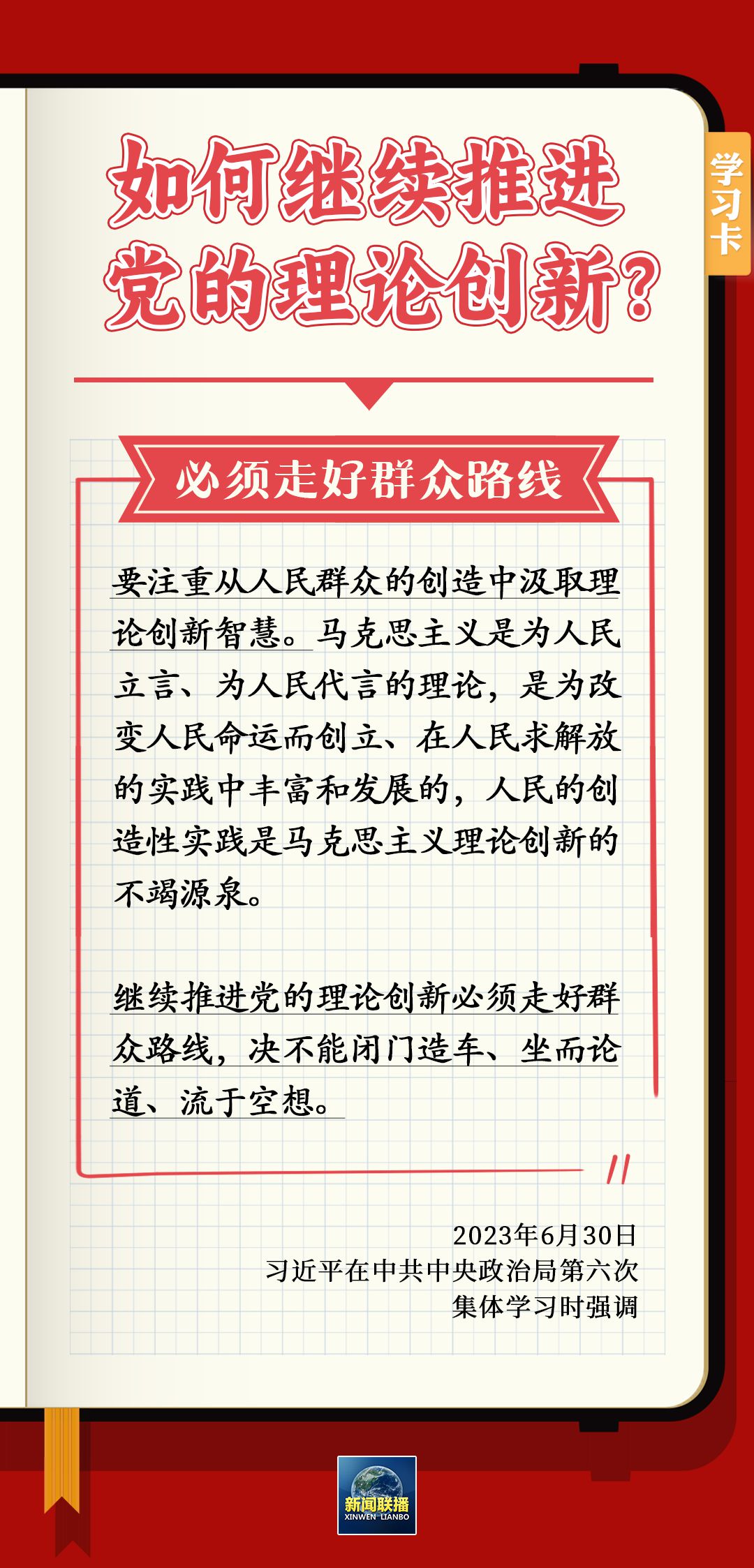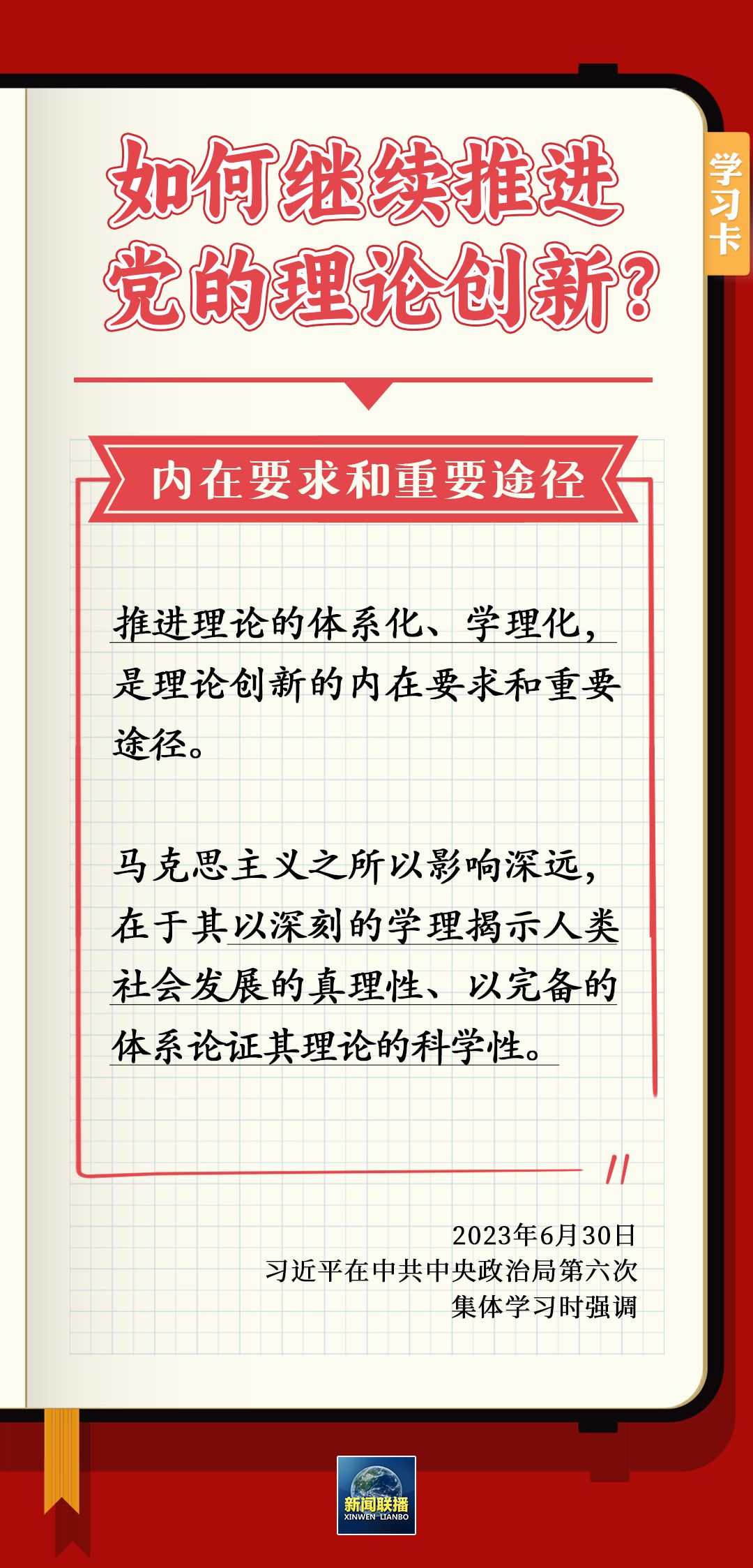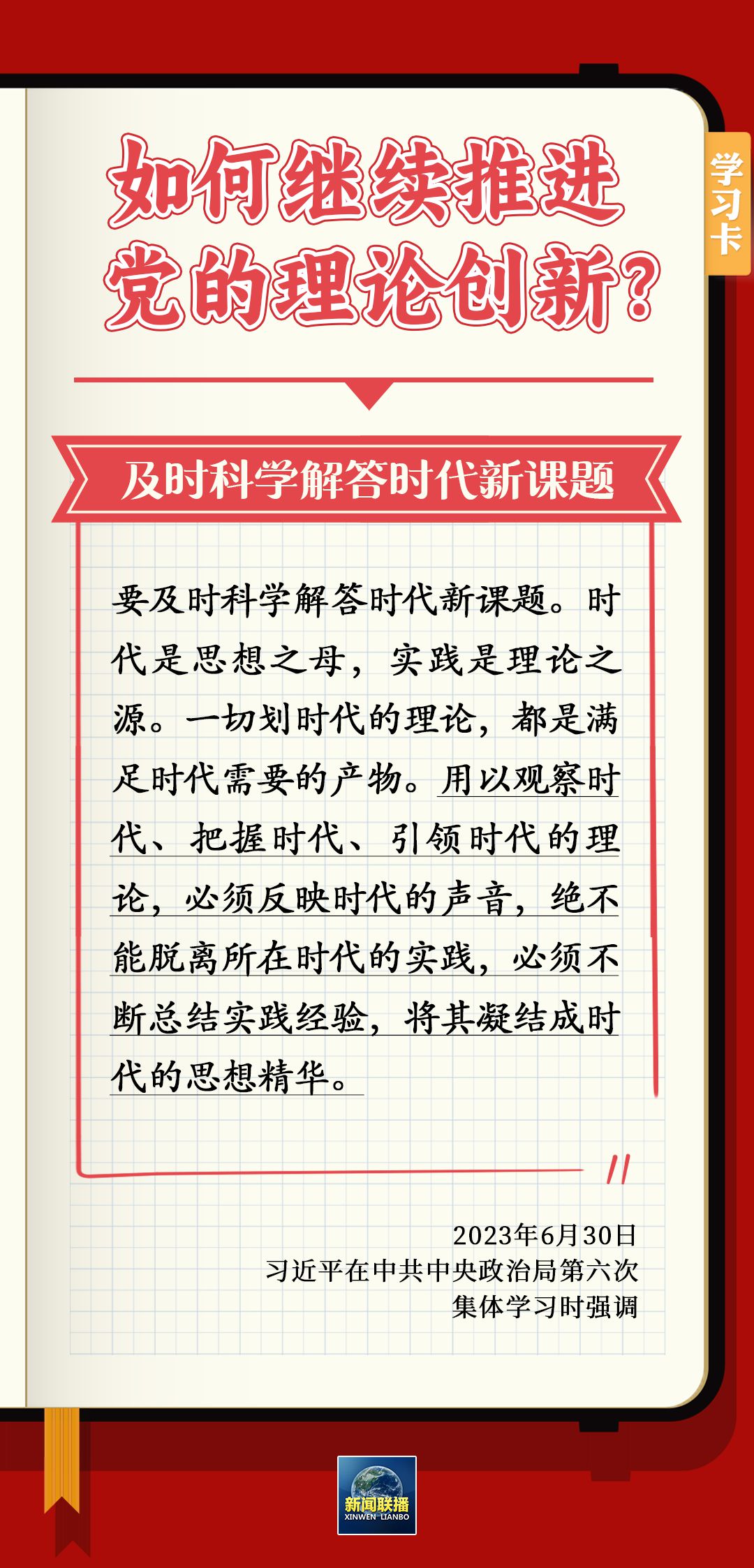 6月30日,習(xí)近平在主持中共中央政治局第六次集體學(xué)習(xí)時強調(diào),要不斷深化對黨的理論創(chuàng)新的規(guī)律性認(rèn)識。為什么要推進理論創(chuàng)新?如何繼續(xù)推進黨的理論創(chuàng)新?一起學(xué)習(xí)↓