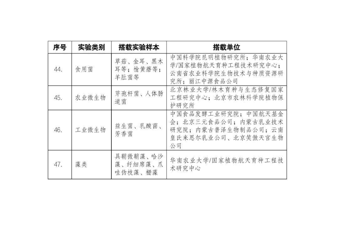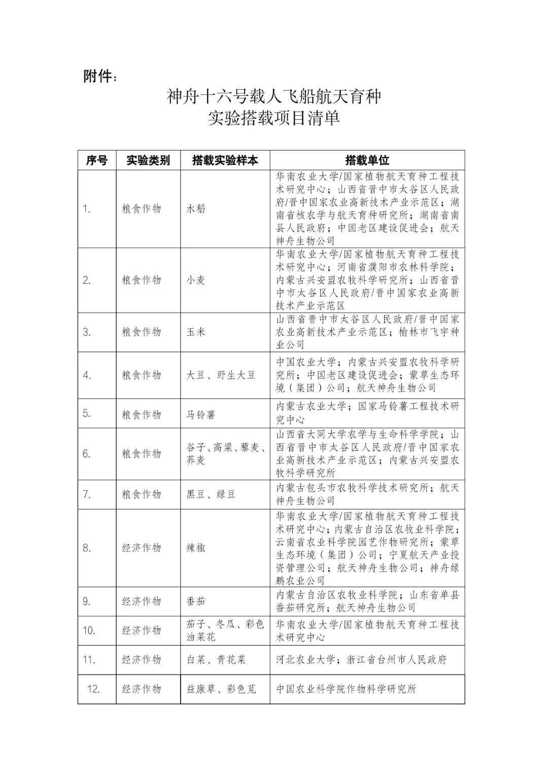 今日,中國載人航天工程辦公室公布神舟十六號載人飛船航天育種實(shí)驗(yàn)項(xiàng)目清單,詳情如下: