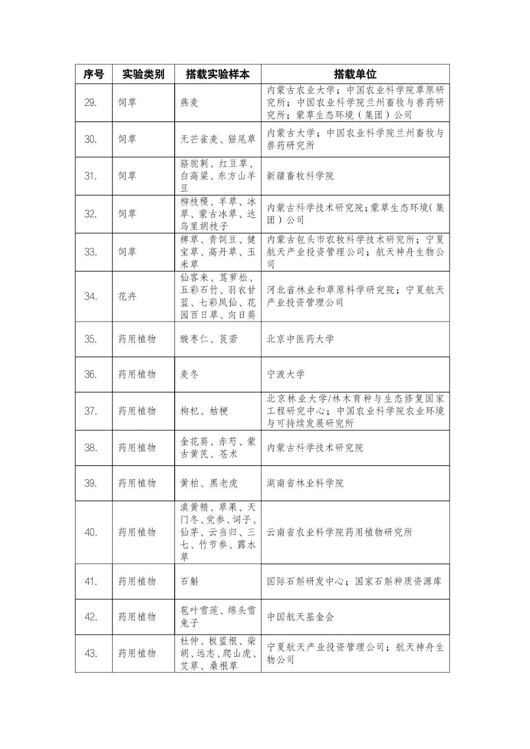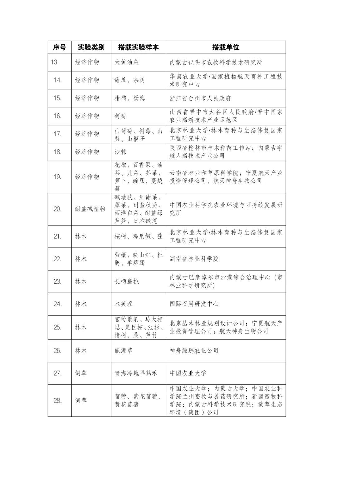 載人航天工程立項(xiàng)實(shí)施以來,始終注重提升工程綜合效益,致力服務(wù)國家經(jīng)濟(jì)社會發(fā)展。在工程歷次飛行任務(wù)中,均安排了航天育種搭載實(shí)驗(yàn)項(xiàng)目。從神舟十六號載人飛船開始,中國載人航天工程辦公室向社會公開征集航天育種搭載實(shí)驗(yàn)項(xiàng)目,于3月23日在工程官網(wǎng)發(fā)布《關(guān)于征集神舟系列載人飛船航天育種實(shí)驗(yàn)項(xiàng)目的機(jī)會公告》,同時(shí)在工程官網(wǎng)開辟“航天育種搭載實(shí)驗(yàn)”管理平臺,接受搭載需求單位申報(bào)實(shí)驗(yàn)項(xiàng)目。辦公室組織專家對申報(bào)項(xiàng)目進(jìn)行評審,遴選出53個(gè)單位的136種份航天育種實(shí)驗(yàn)材料實(shí)施搭載。包括農(nóng)作物47份(糧食作物種子12份、經(jīng)濟(jì)作物種子28份、耐鹽堿植物7份);林草、花卉和藥用植物76份(林木17份、飼草21份、花卉7份、藥用植物31份);微生物和其它13種(農(nóng)業(yè)微生物菌種2種、工業(yè)微生物菌種3種、食用菌3種、藻類和苔蘚5種)(清單附后)。