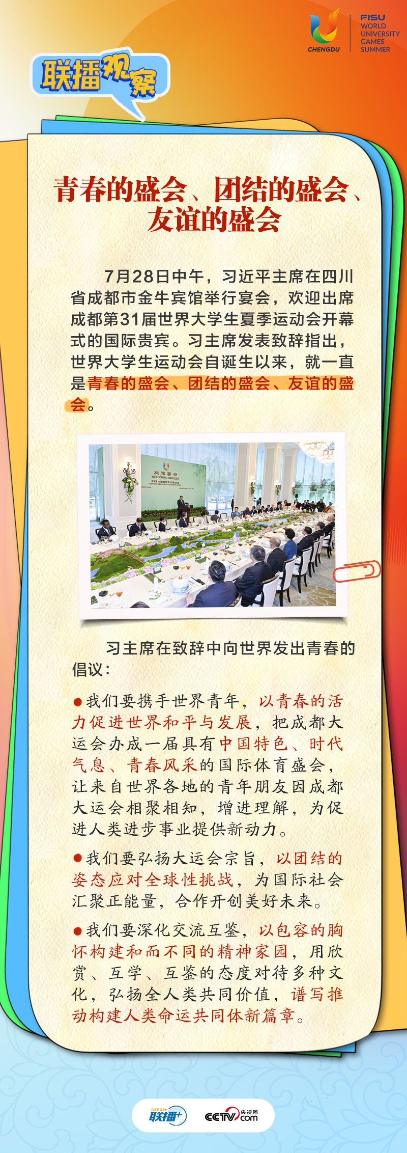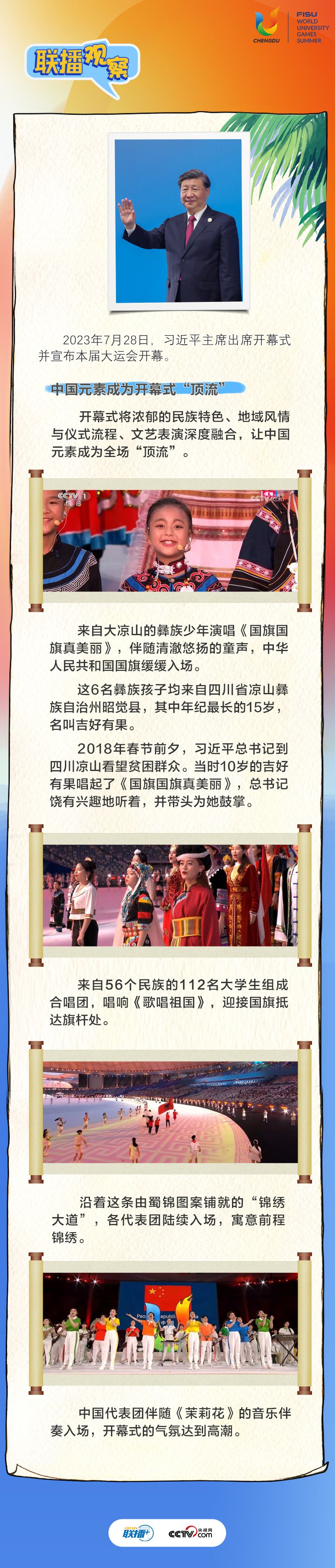 7月28日晚,第31屆世界大學生夏季運動會開幕式在四川省成都市舉行。習近平主席出席開幕式并宣布本屆大運會開幕。