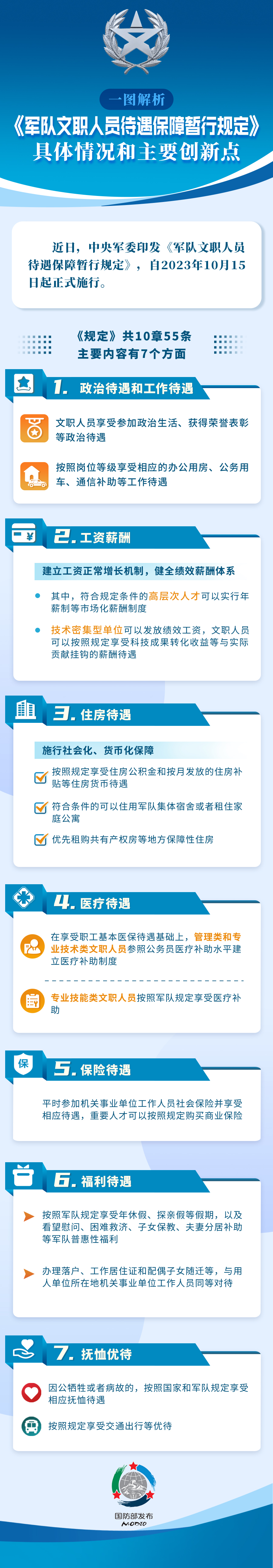 六是福利待遇。按照軍隊規(guī)定享受年休假、探親假等假期,以及看望慰問、困難救濟(jì)、子女保教、夫妻分居補(bǔ)助等軍隊普惠性福利。辦理落戶、工作居住證和配偶子女隨遷等,與用人單位所在地機(jī)關(guān)事業(yè)單位工作人員同等對待。